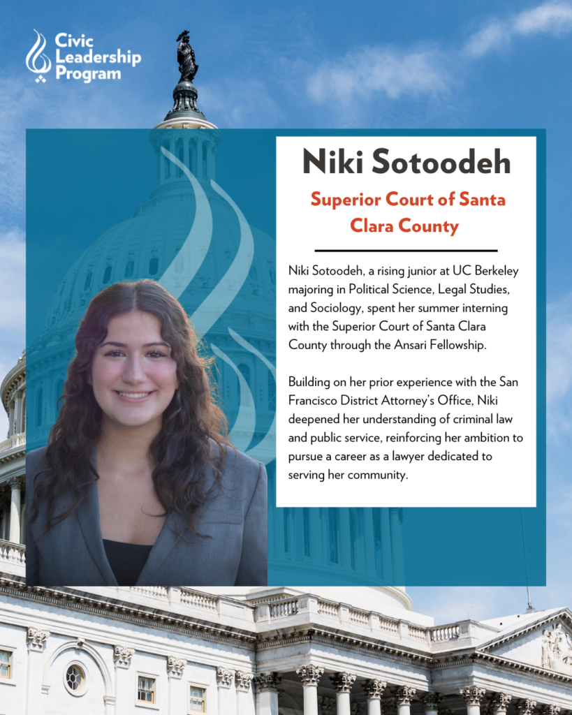 PAAIA’s 2025 Ansari Fellow, Niki Sotoodeh, is a law student at UC Berkeley School of Law. This summer, she interned at the Superior Court of California, County of Santa Clara, under Judge Nahal Iravani-Sani, where she gained hands-on experience observing court proceedings, conducting legal research, and exploring the intersection of mental health and criminal justice. Below, she reflects on her internship and how the Ansari Fellowship supported her journey toward a career in criminal law and public service.