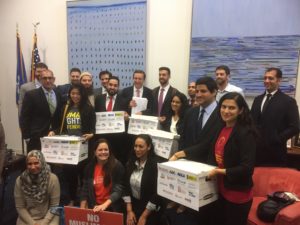 The petition was delivered to the offices of Senator Chris Murphy (D-CT), Senator Mitch McConnell (R-KY), Senator Chuck Schumer (D-NY), and Senator Diane Feinstein (D-CA). With the House of Representatives out of session this week, the petition will be mailed to House Speaker Paul Ryan (R-WI) and House Minority Leader Nancy Pelosi (D-CA). Today also marks the day that the September 24 presidential Proclamation, commonly known as Muslim Ban 3.0, was set to go into effect.