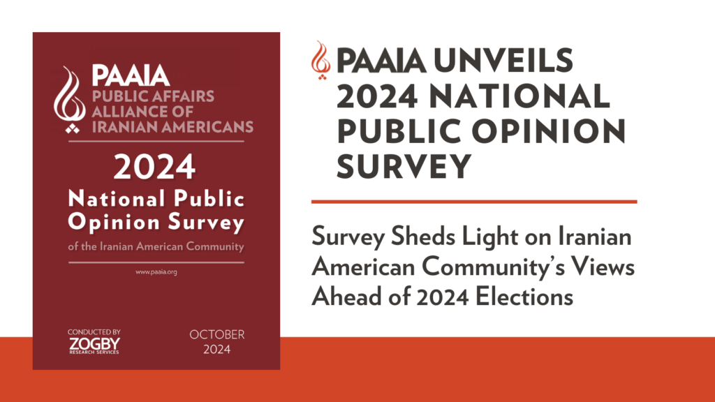 The Public Affairs Alliance of Iranian Americans (PAAIA), a nonprofit and nonpartisan organization serving the interests of the Iranian American community, today released the findings of its 2024 National Public Opinion Survey. The survey was conducted from August 5th to 13th of this year and is based on a representative sample of 404 Iranian Americans with a margin of error of +/- 4.9 percentage points at a 95% confidence level. This year’s survey captures the Iranian American community’s views on critical issues including the 2024 presidential election, the Woman, Life, Freedom Movement in Iran, and more.